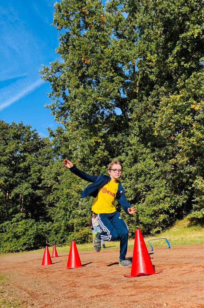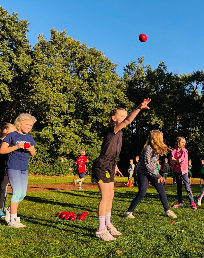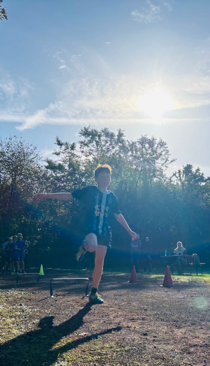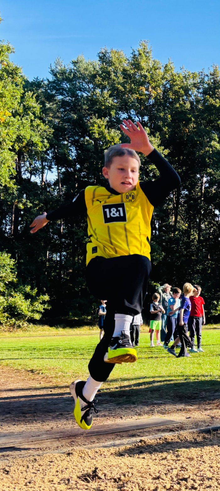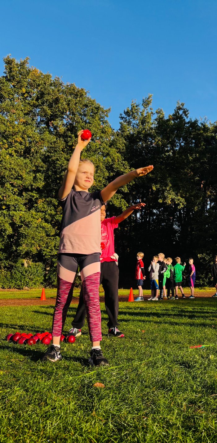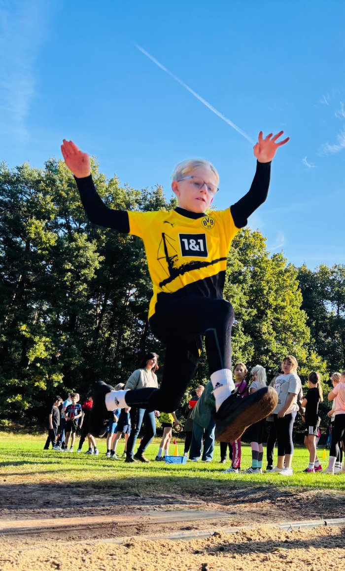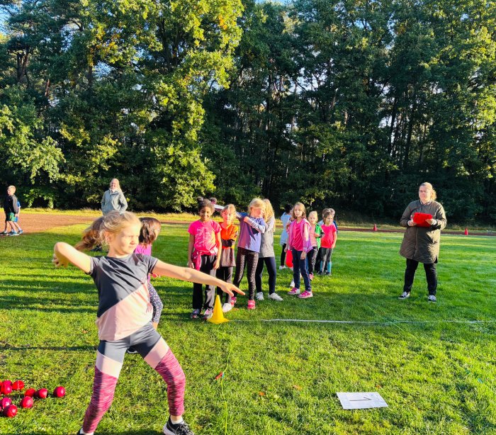 Am zweiten Tag der Bundesjugendspiele waren die Klassen 2, 3 und 4 an der Reihe. Bei dann sogar strahlendem Herbstwetter starteten alle gemeinsam mit dem Bewegungslied „Tante Rita“, das für gute Laune und warme Muskeln sorgte. Danach ging es an die vier Stationen: Ausdauerlauf, Sprint, Sprung und Wurf.