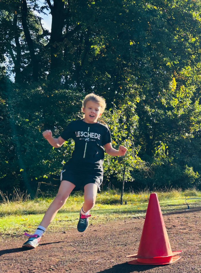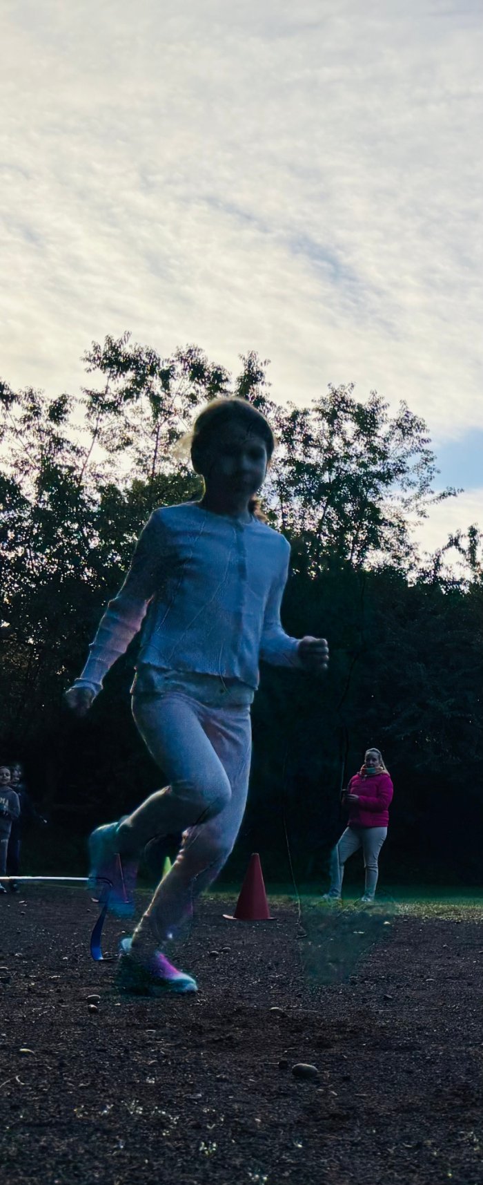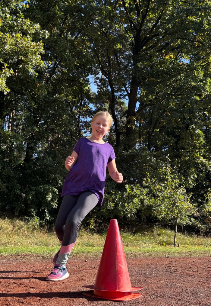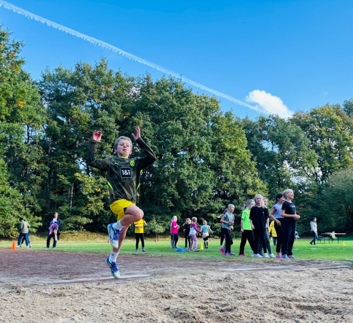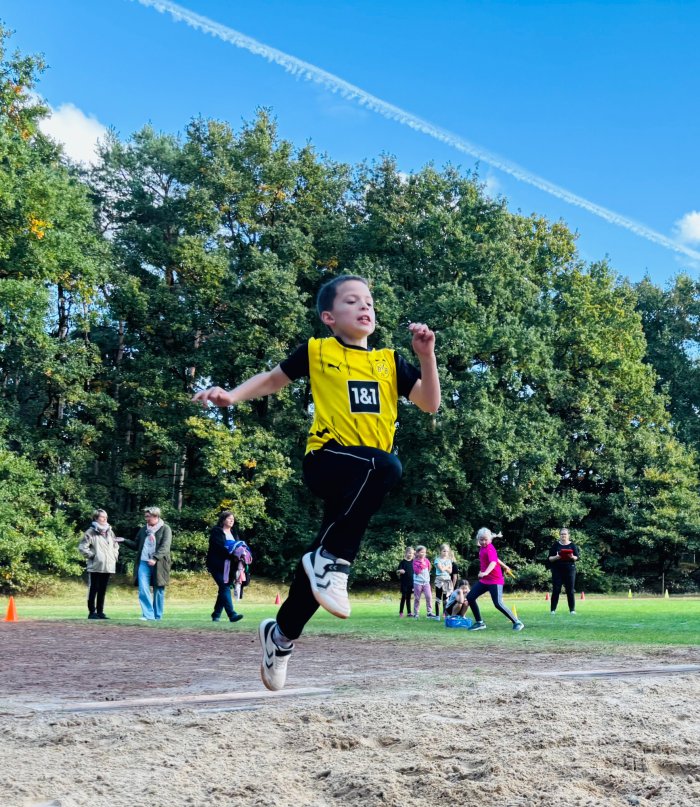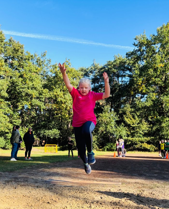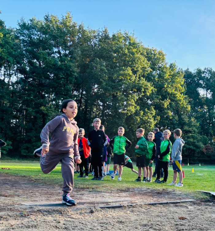 Am zweiten Tag der Bundesjugendspiele waren die Klassen 2, 3 und 4 an der Reihe. Bei dann sogar strahlendem Herbstwetter starteten alle gemeinsam mit dem Bewegungslied „Tante Rita“, das für gute Laune und warme Muskeln sorgte. Danach ging es an die vier Stationen: Ausdauerlauf, Sprint, Sprung und Wurf.