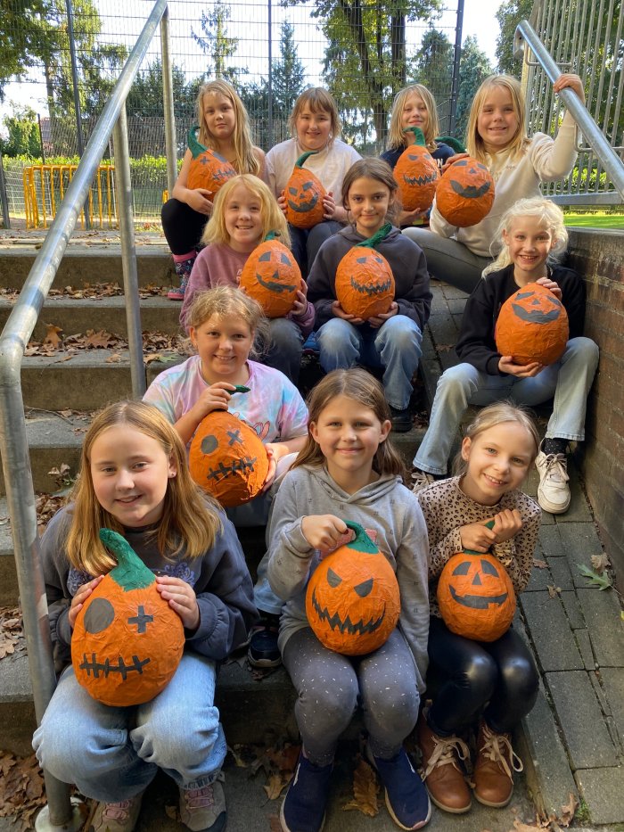 Passend zur Jahreszeit haben die Kinder der Kreativ-AG Kürbisse aus Pappmaschee gestaltet. Aus alten Zeitungen, mit Kleister und sehr viel Ausdauer wurden die Kürbisse modelliert und anschließend noch angemalt. Ein passendes Gesicht durfte natürlich auch nicht fehlen.
