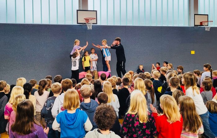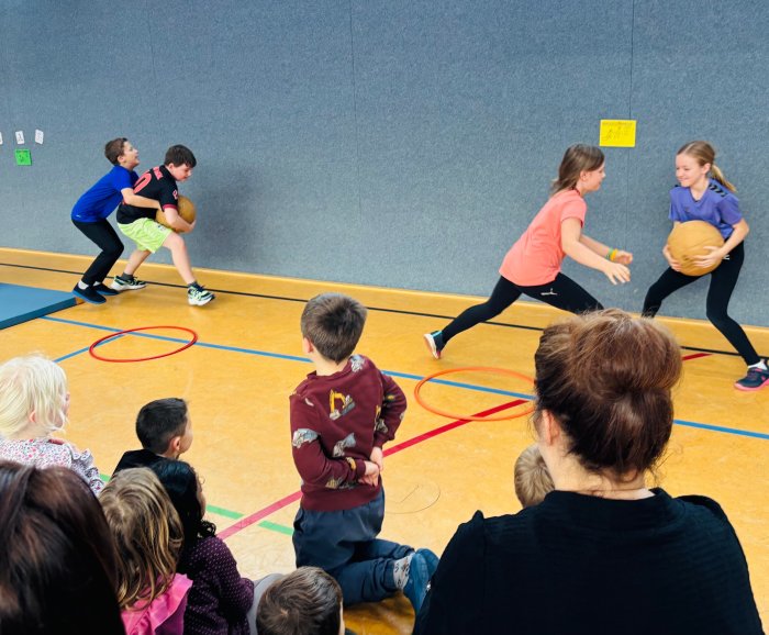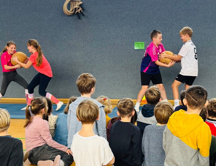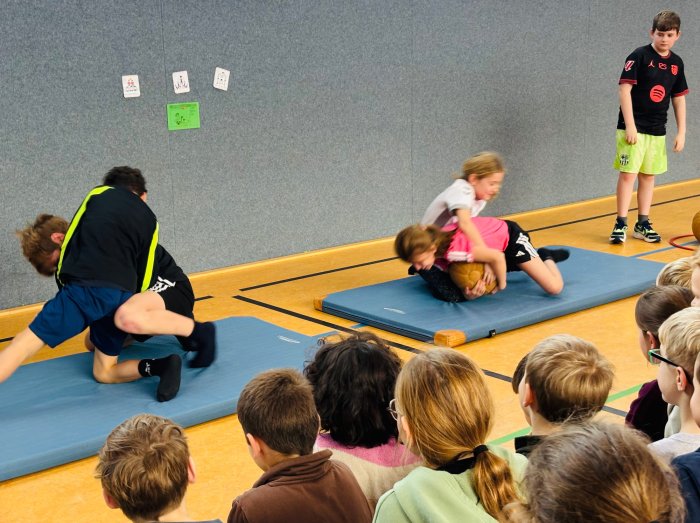 Zudem erhielten die Gäste Einblicke in den Sportunterricht unserer Schule: Die Klasse 3 präsentierte verschiedene Pyramiden aus dem Bereich der Akrobatik, während Klasse 4 Übungen aus dem Bereich Kämpfen und Ringen vorführte.